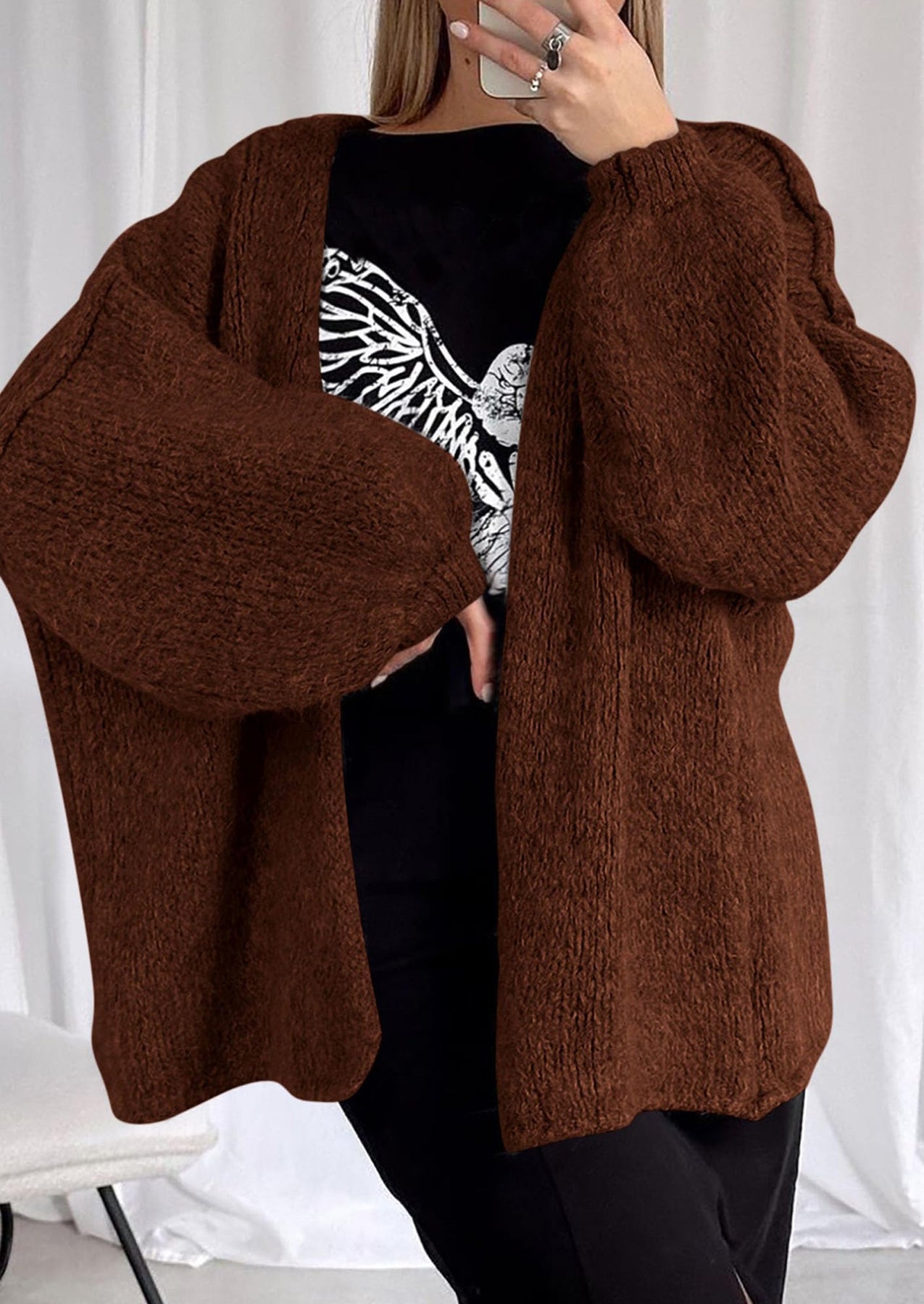• Cardigan Details: Lantern sleeves, open-front design